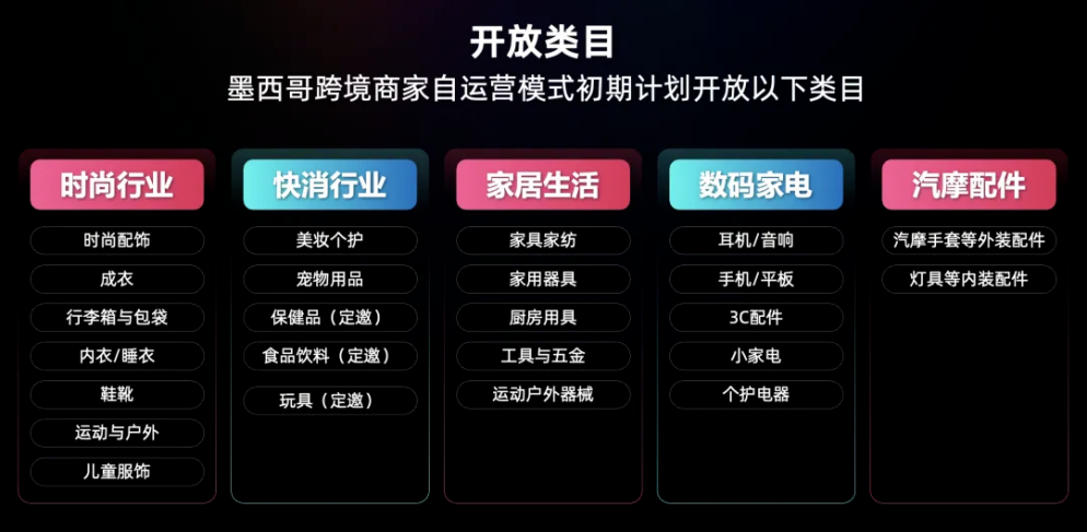 1.优先类目:时尚、快消、家居、数码、汽摩配件,覆盖高频消费场景。