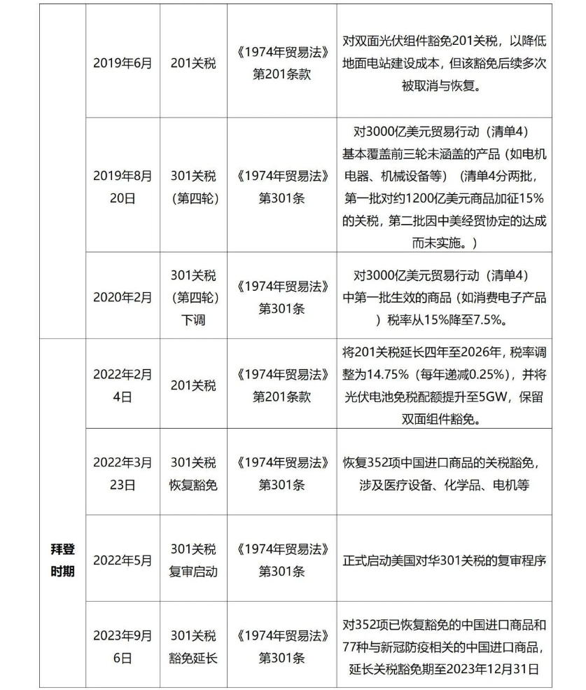 特别值得注意的是:301关税就是特朗普第一任总统期间加征的关税,拜登政府时期加征的关税是延续特朗普的301关税。特朗普时期的301关税在 7.5%-25% 之间,拜登时期将个别产品的301关税提高至 100%,如注射器和针头、电动汽车等。其中,有些商品的301关税被豁免排除。
