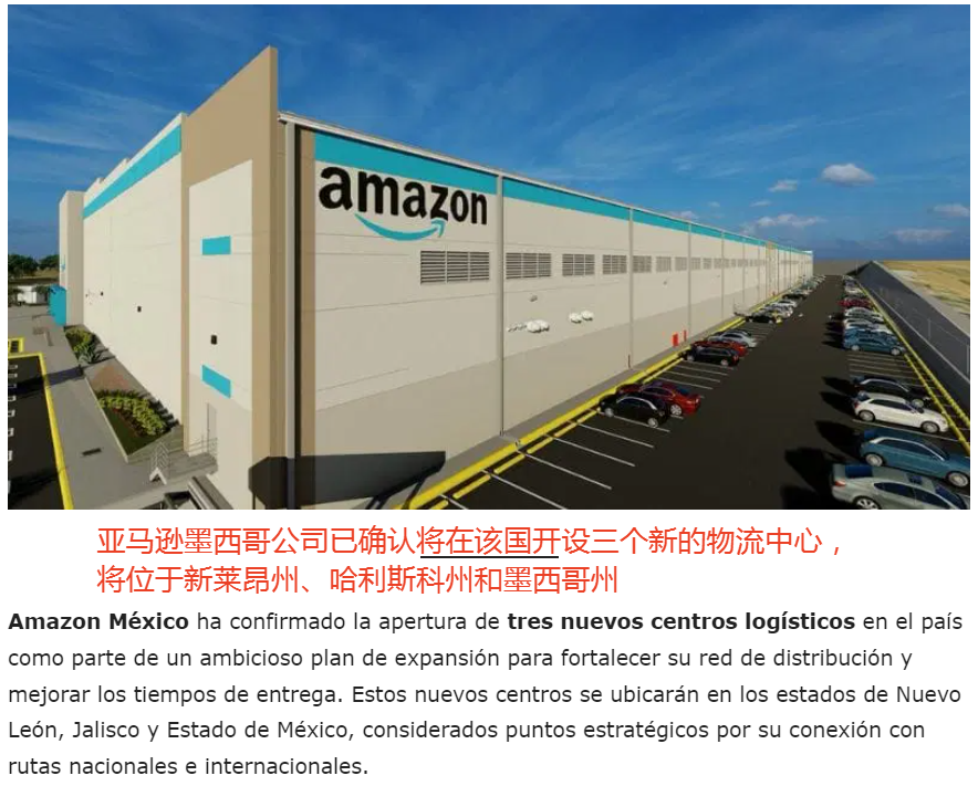 亚马逊墨西哥公司宣布,将投资5亿美元在墨西哥新建三个大型配送中心。这三个战略要地分别选址于:新莱昂州 (Nuevo León)、哈利斯科州 (Jalisco)、墨西哥州 (State of México)。