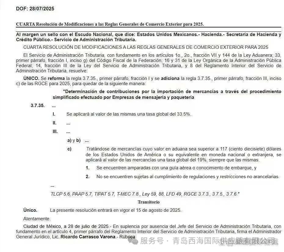 墨西哥通过财政部于7月28日通过《联邦官方公报》发布决议,自2025年8月15日起调整跨境包裹进口税收规则。